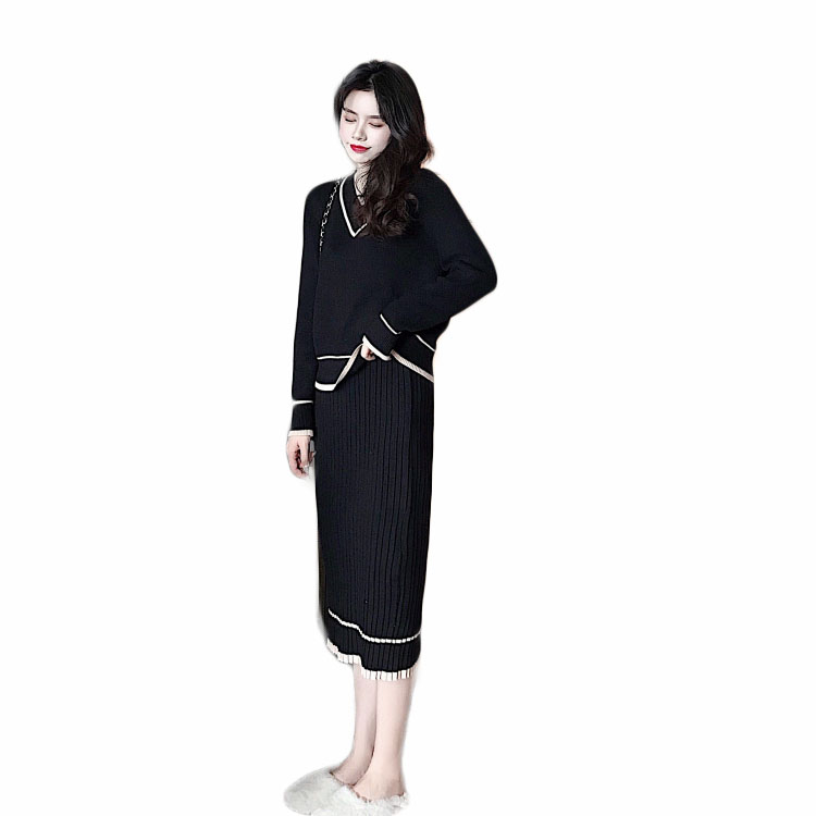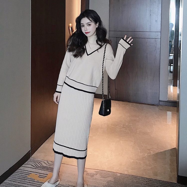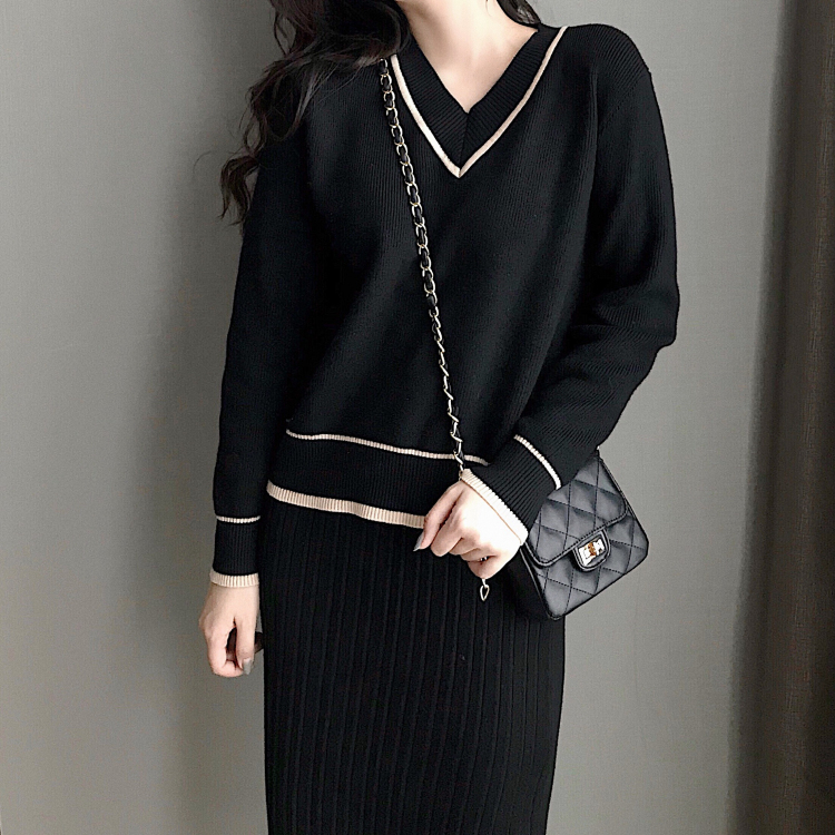 / 復古韓國chic風小香風寬松V領針織百褶連衣裙氣質套裝時尚兩件套