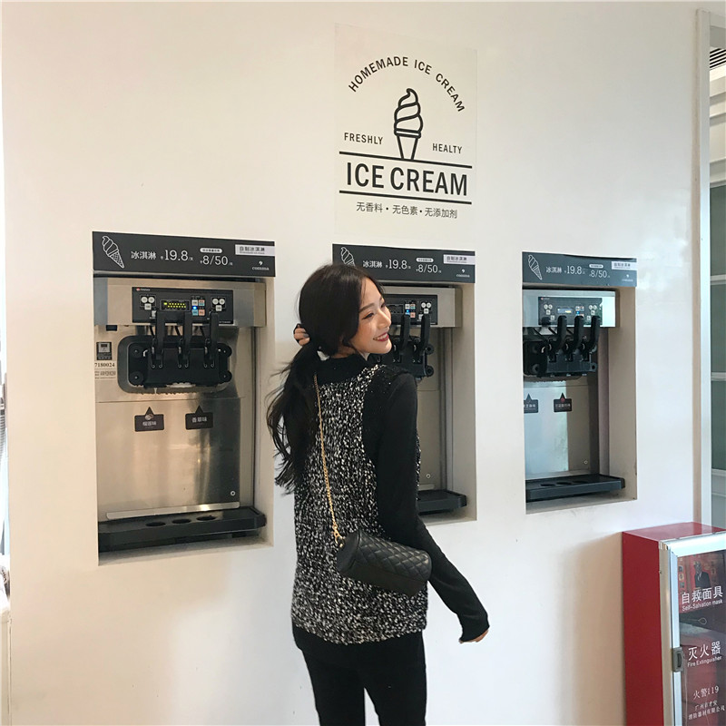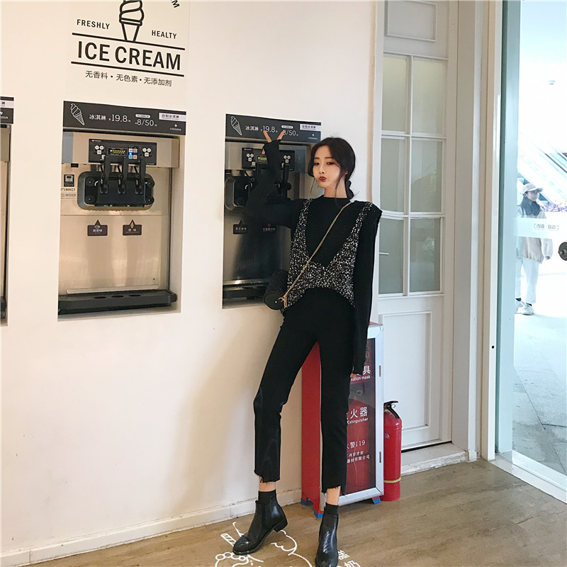 女神套裝秋冬慵懶寬松閃閃拼接馬甲+高腰顯瘦不規則微喇叭牛仔褲
