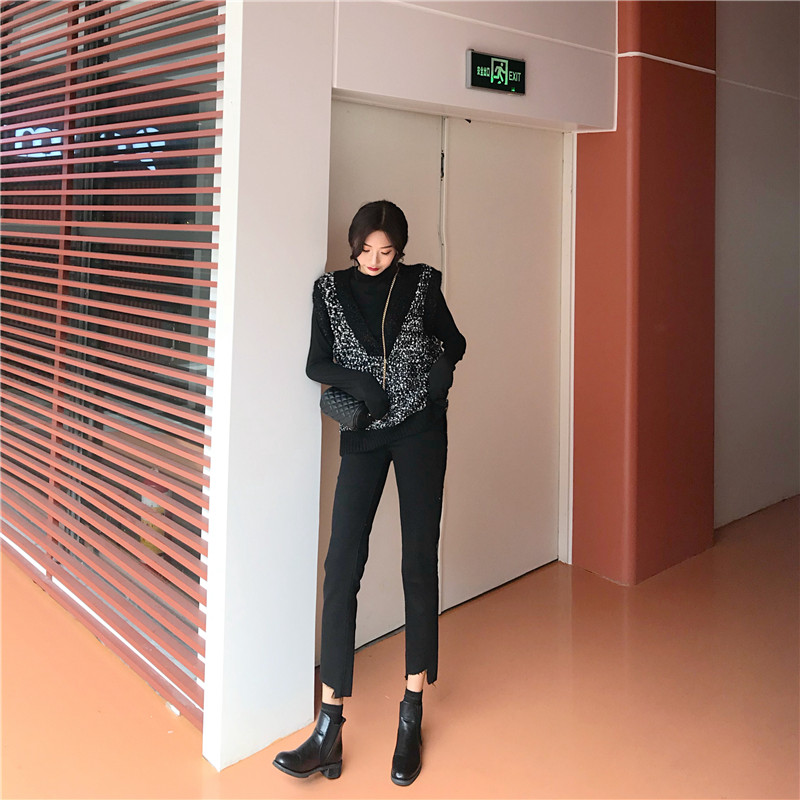 / 女神套裝秋冬慵懶寬松閃閃拼接馬甲+高腰顯瘦不規則微喇叭牛仔褲