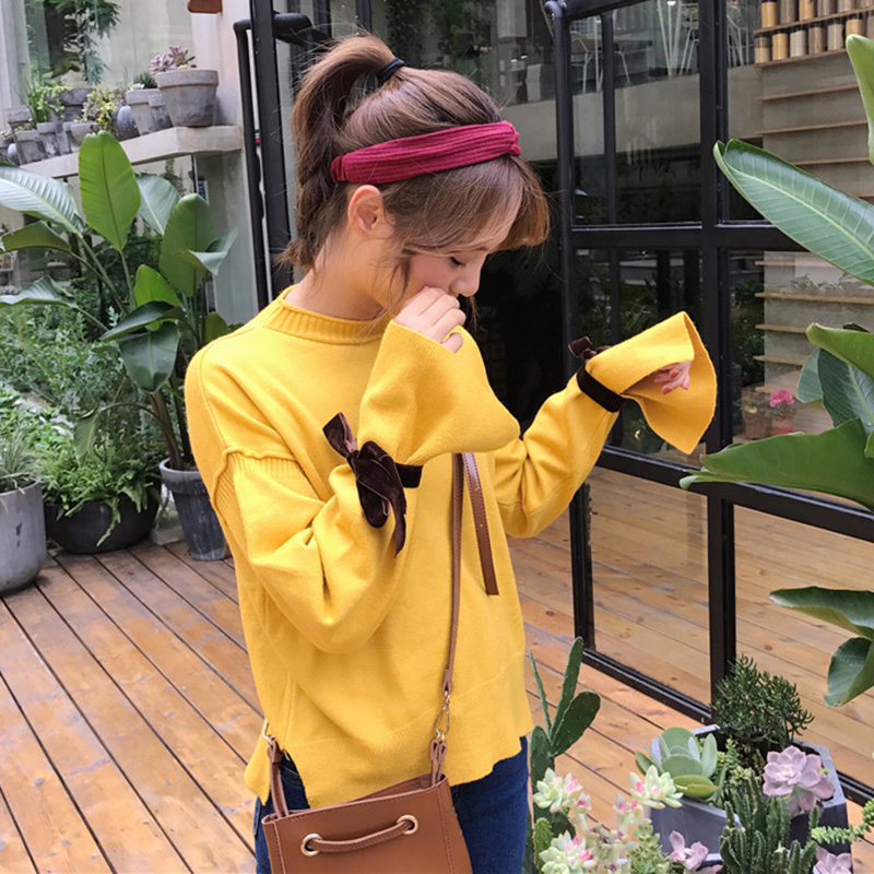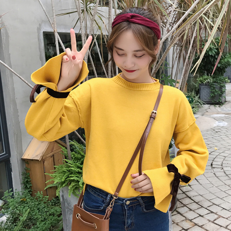 / 慵懶風毛衣秋裝女2018新款小清新系帶荷葉長袖針織衫寬松圓領上衣