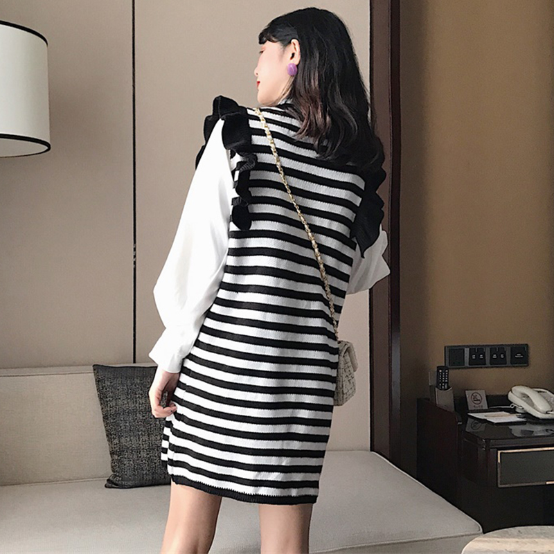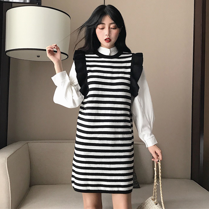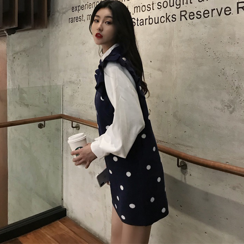 / 御姐套裝女秋冬新款時尚波點修身針織背心連衣裙襯衫白色長袖襯衫