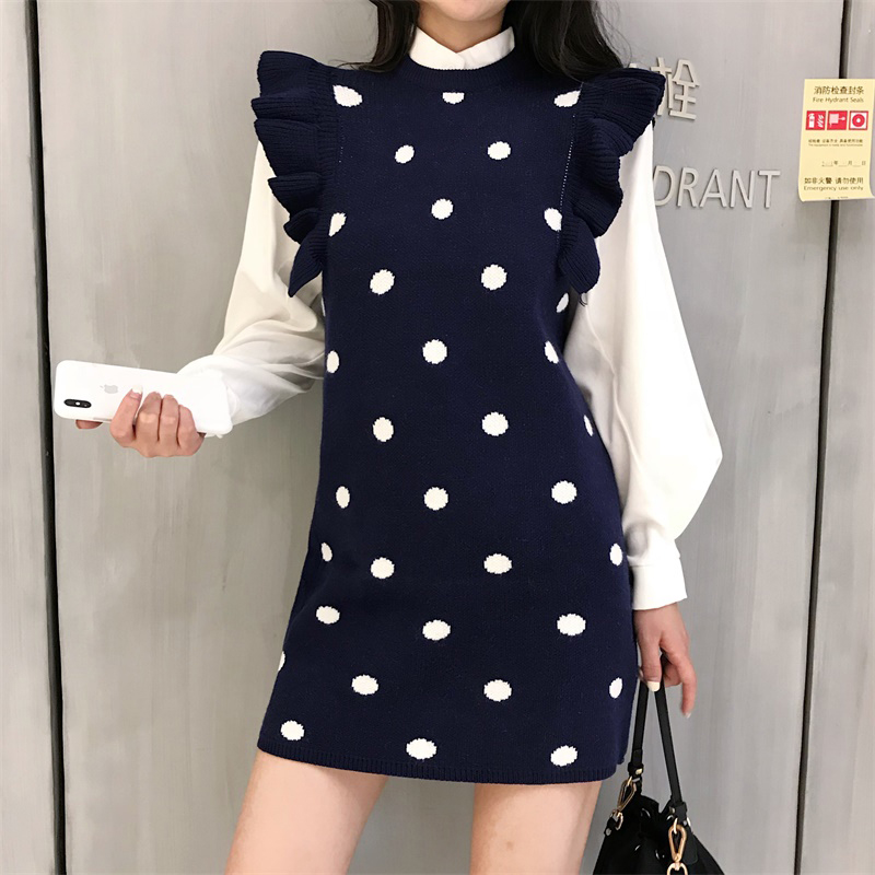 御姐套裝女秋冬新款時尚波點修身針織背心連衣裙襯衫白色長袖襯衫