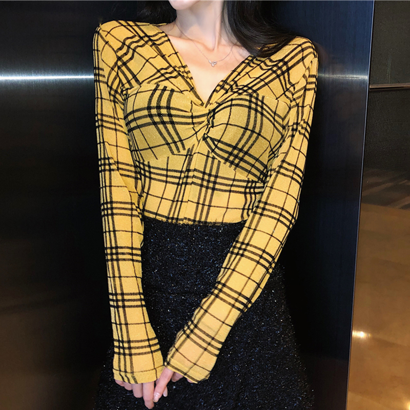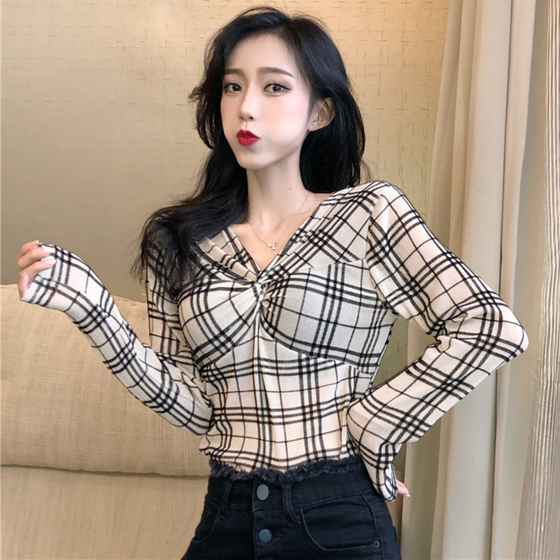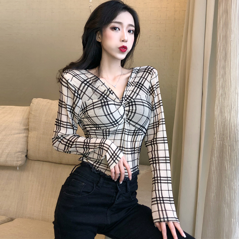 / 復古網紗格子修身顯瘦打底衫女秋冬裝新款時尚V領長袖上衣學生T恤