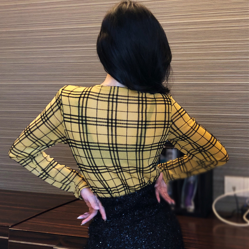復古網紗格子修身顯瘦打底衫女秋冬裝新款時尚V領長袖上衣學生T恤