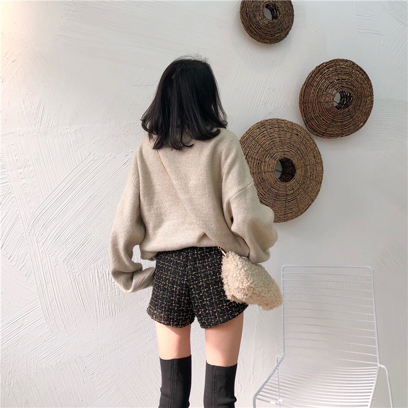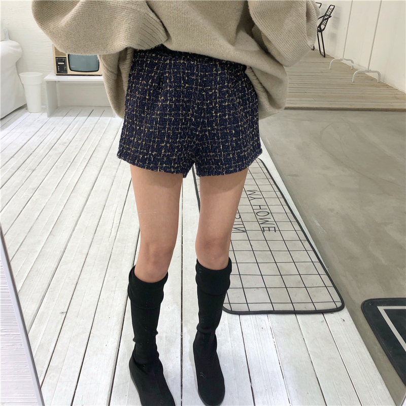 / 港味chic秋冬季新款褲子pu皮拼接格子粗花呢短褲女加絨寬松闊腿褲
