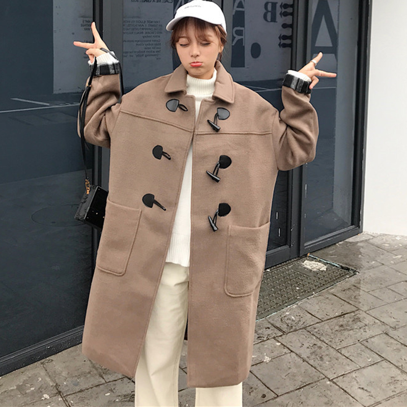 女裝秋冬2018新款復古中長款夾棉呢子大衣學生休閑寬松黑色外套潮
