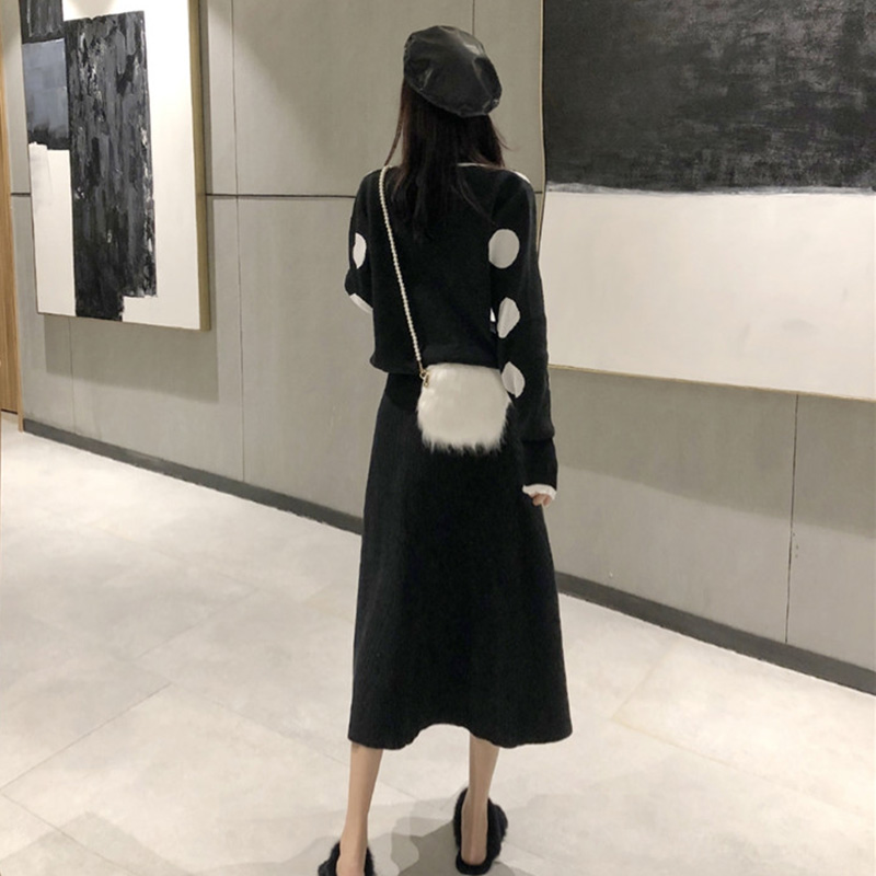 / 復古套裝女秋冬新款時尚波點V領毛衣外套中長款高腰針織半身裙子