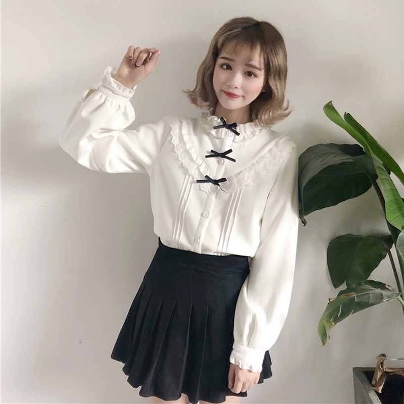 / 清新軟妹加絨白襯衫秋冬2018新款女裝學生木耳邊蝴蝶結燈籠袖上衣