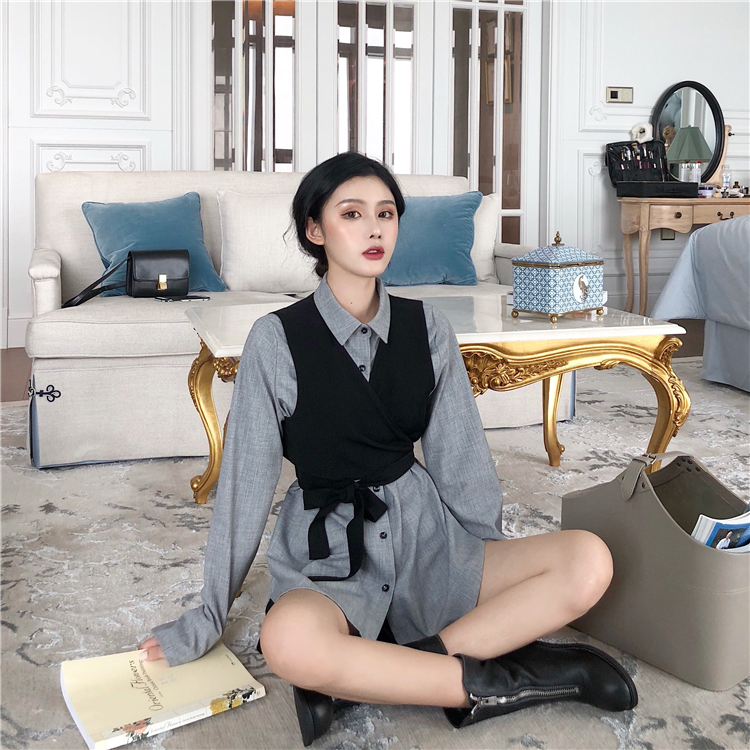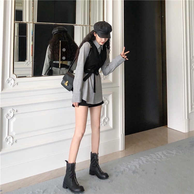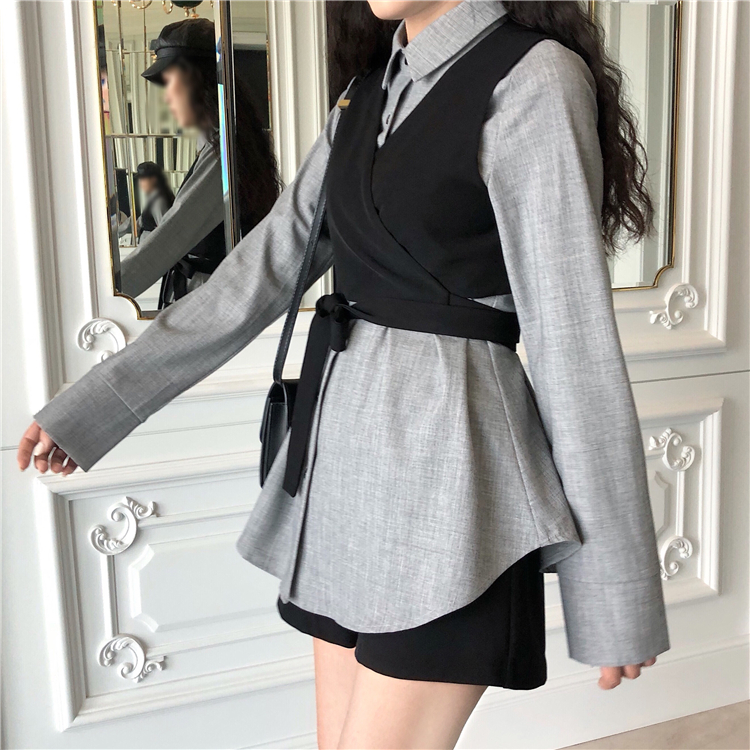 秋裝女2018新款小香風長袖襯衫+短款綁帶馬甲休閑短褲套裝兩件套