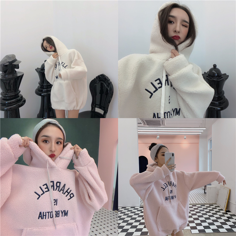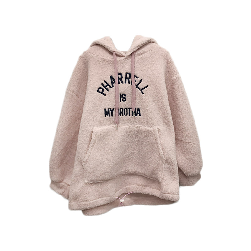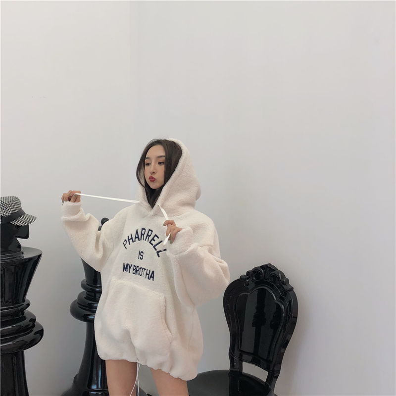 / 韓版慵懶風上衣女寬松連帽刺繡字母羊羔毛套頭中長款衛衣外套女潮