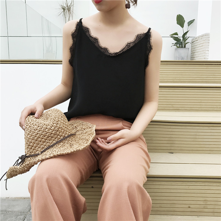 / 春裝新款女裝韓國chic風純色睫毛蕾絲V領吊帶衫氣質打底小背心女