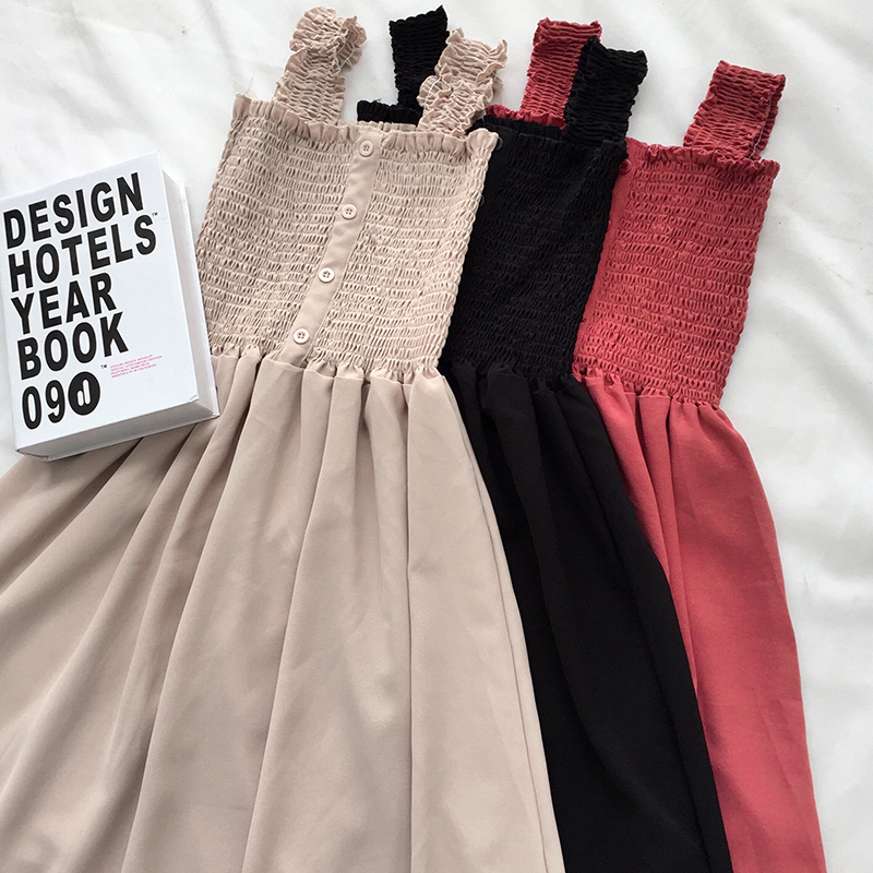 / 2018女夏裝新款韓版高腰顯瘦黑色吊帶連衣裙氣質無袖A字中長裙子