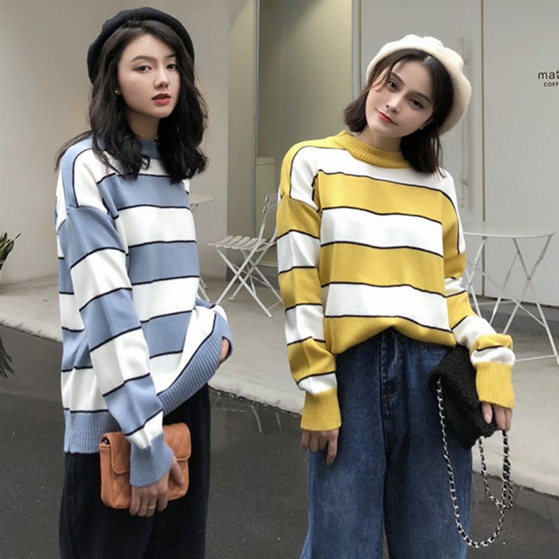 時尚條紋針織衫女秋冬裝新款圓領慵懶風毛衣寬松長袖上衣休閑外套