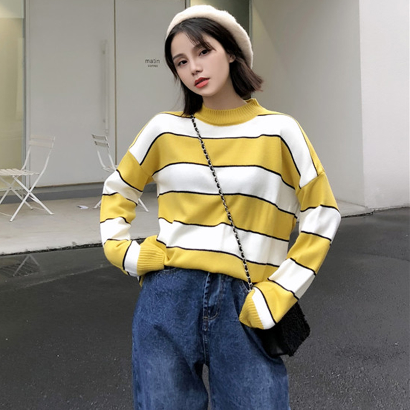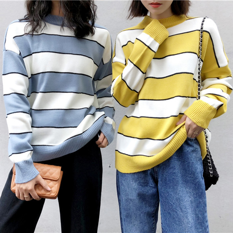 / 時尚條紋針織衫女秋冬裝新款圓領慵懶風毛衣寬松長袖上衣休閑外套