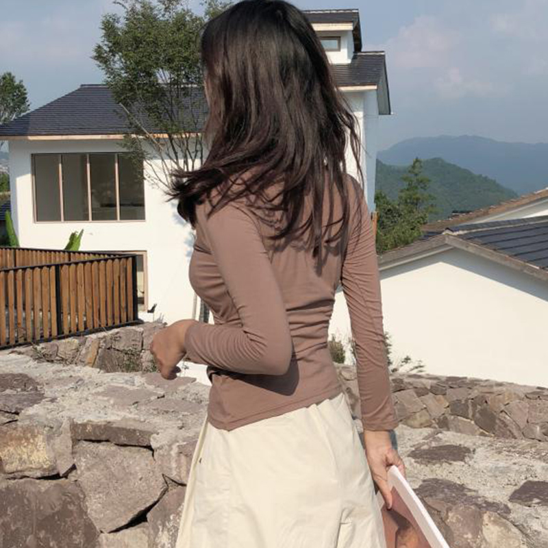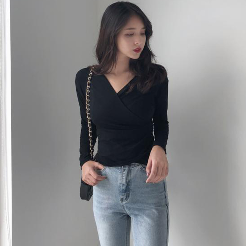 長袖打底衫早秋新款女裝復古氣質V領緊身上衣時尚百搭黑色顯瘦T恤