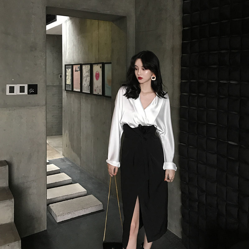 / 光澤感性感大v領襯衣女+復古OL風中長款花苞式高腰開叉半裙兩件套