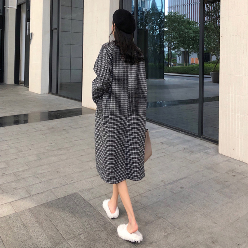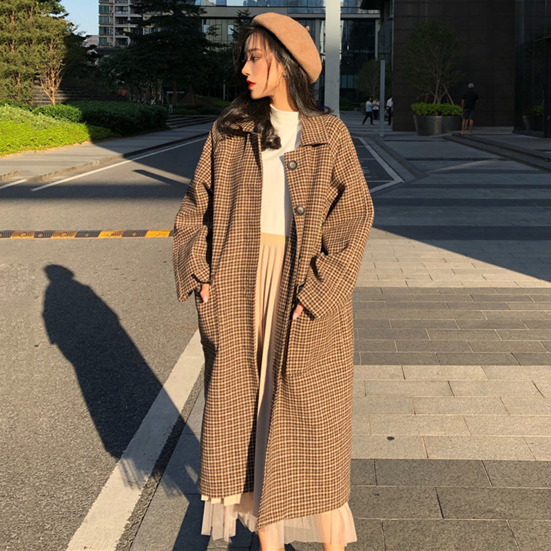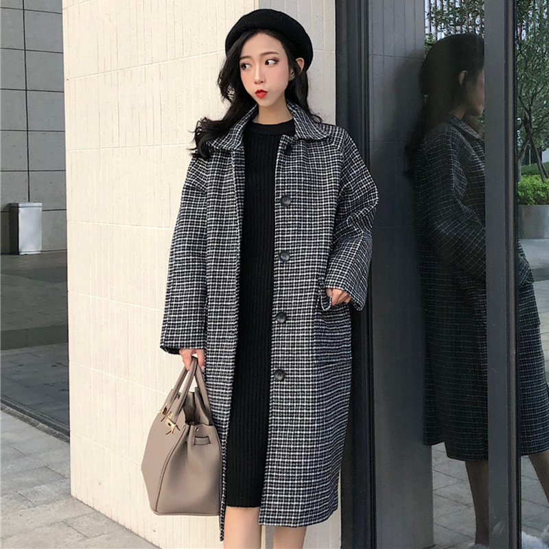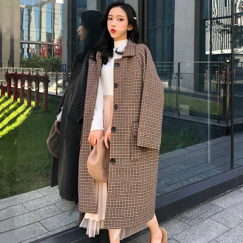 2018流行毛呢外套女秋冬裝新款赫本開衫大衣寬松中長款格子風衣潮