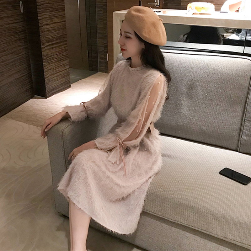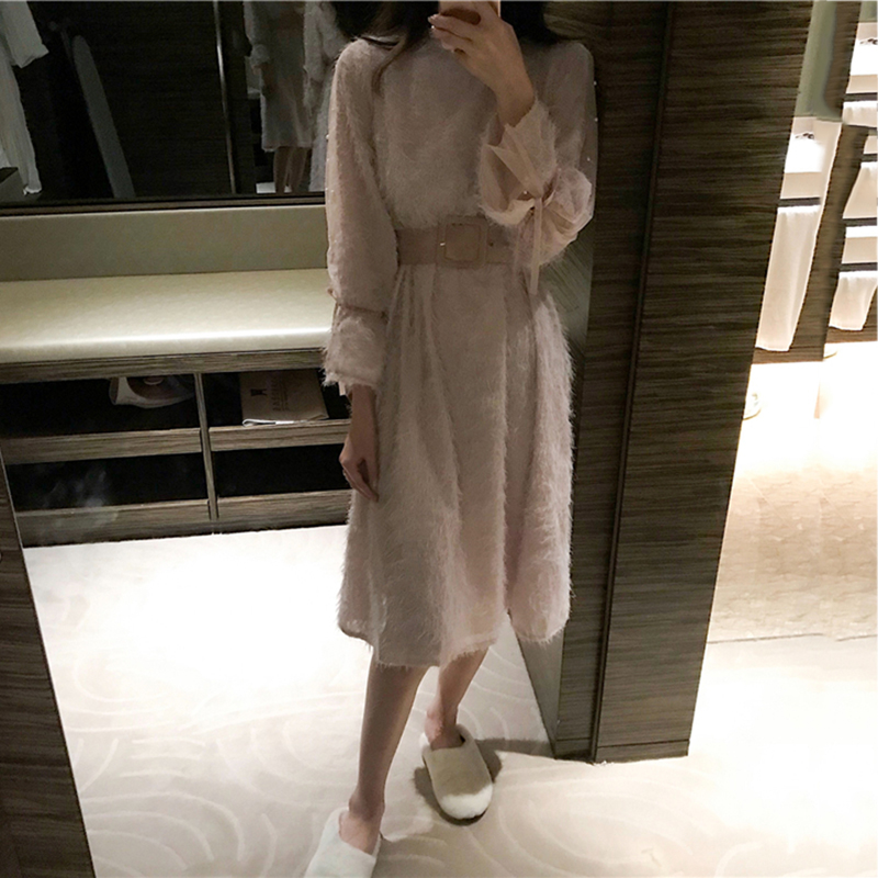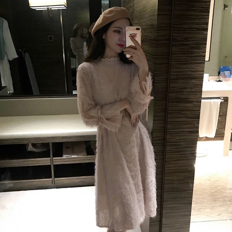 法系少女茶歇裙秋冬裝2018新款高腰中長款花邊立領毛絨A字連衣裙