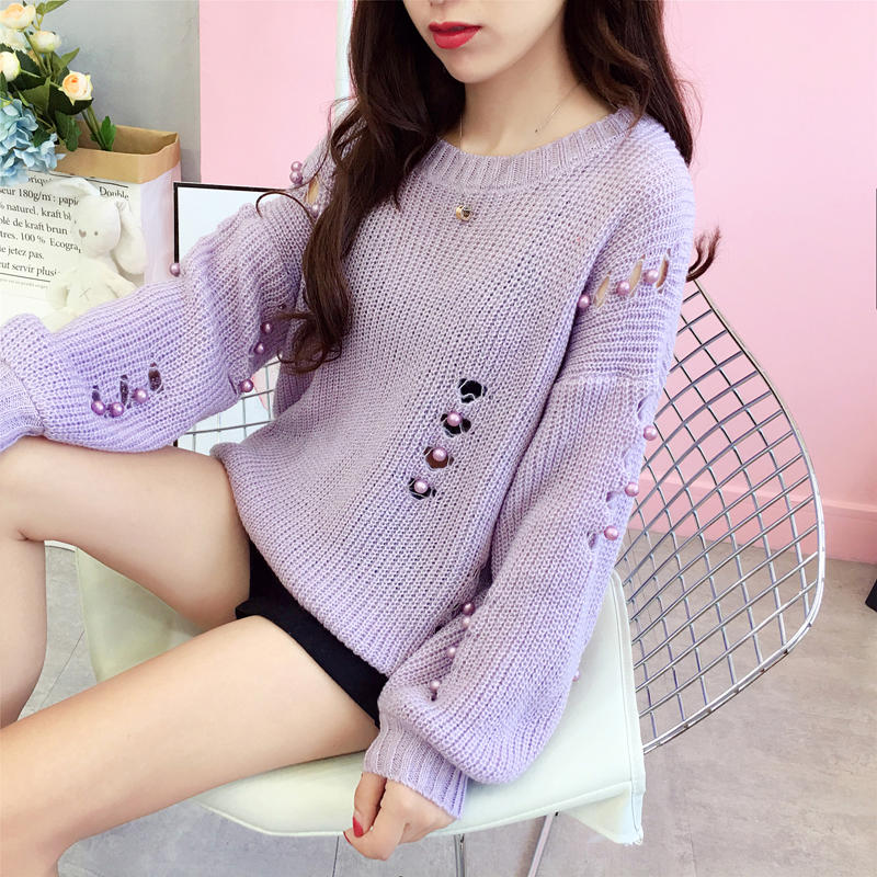 / 慵懶風鏤空破洞透視針織衫女秋冬裝2018新款韓版寬松釘珠毛衣外套