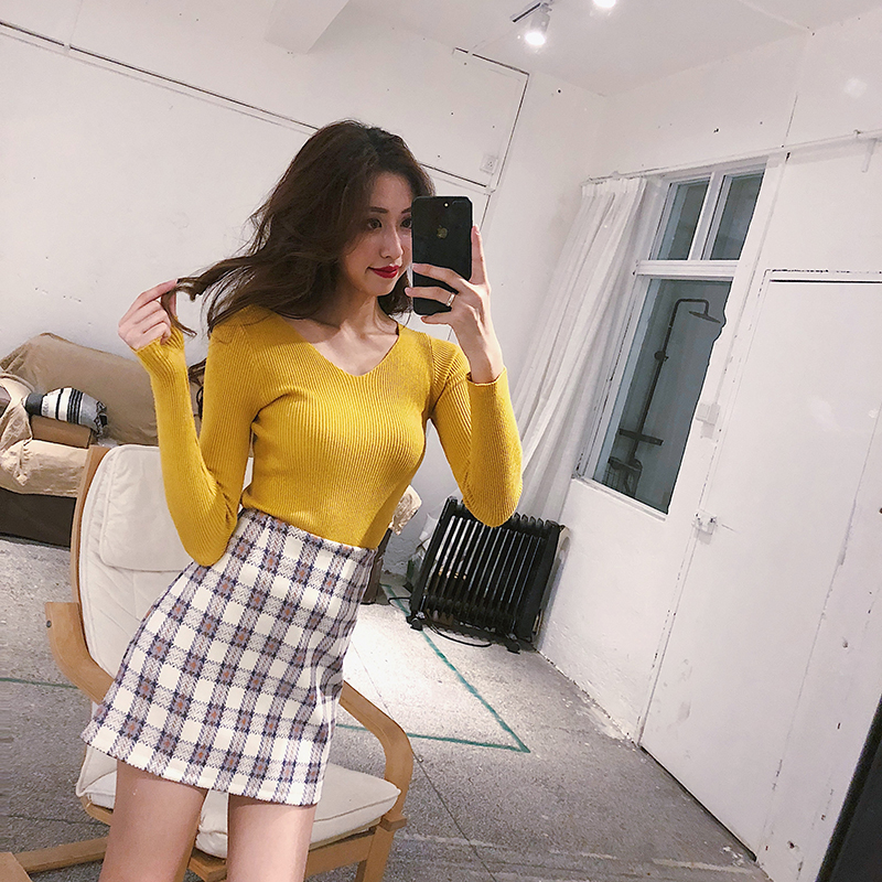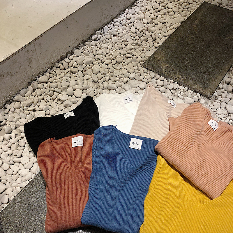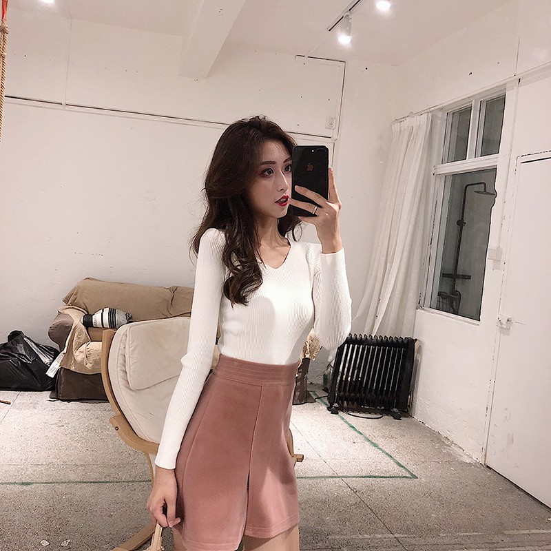 / 韓版修身顯瘦V領針織衫女2018新款百搭簡約純色坑條長袖打底上衣