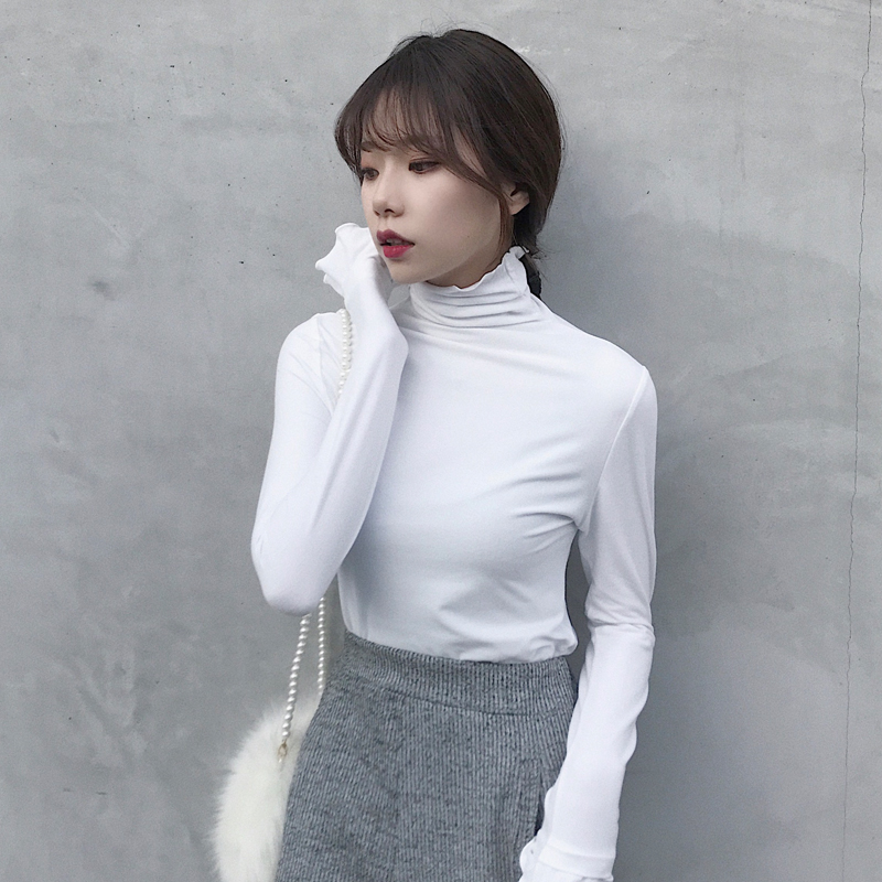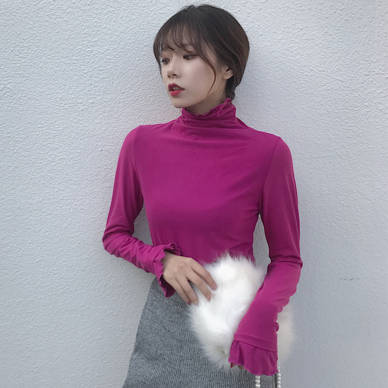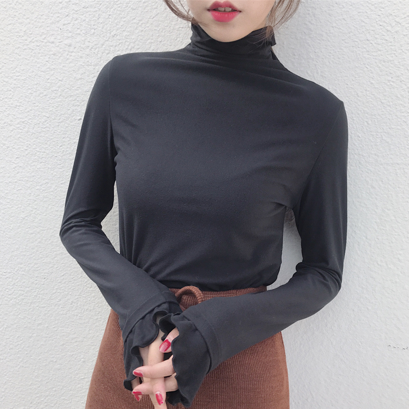 / 韓版時尚早秋上衣女慵懶修身顯瘦波浪邊高領打底衫女長袖T恤上衣