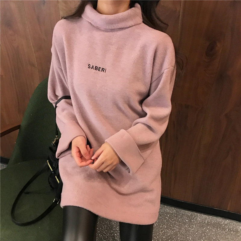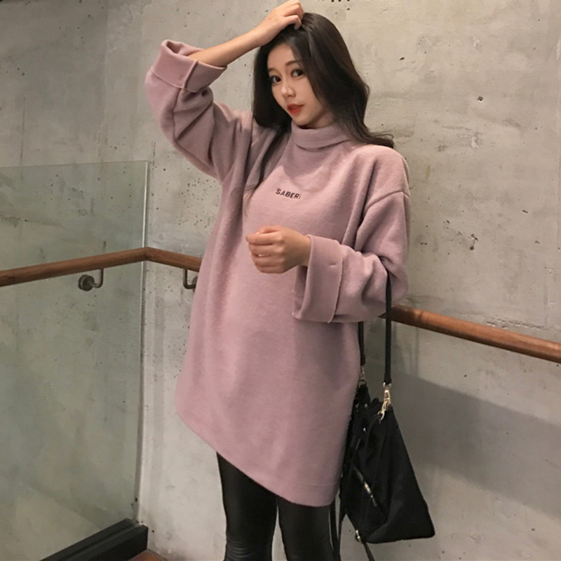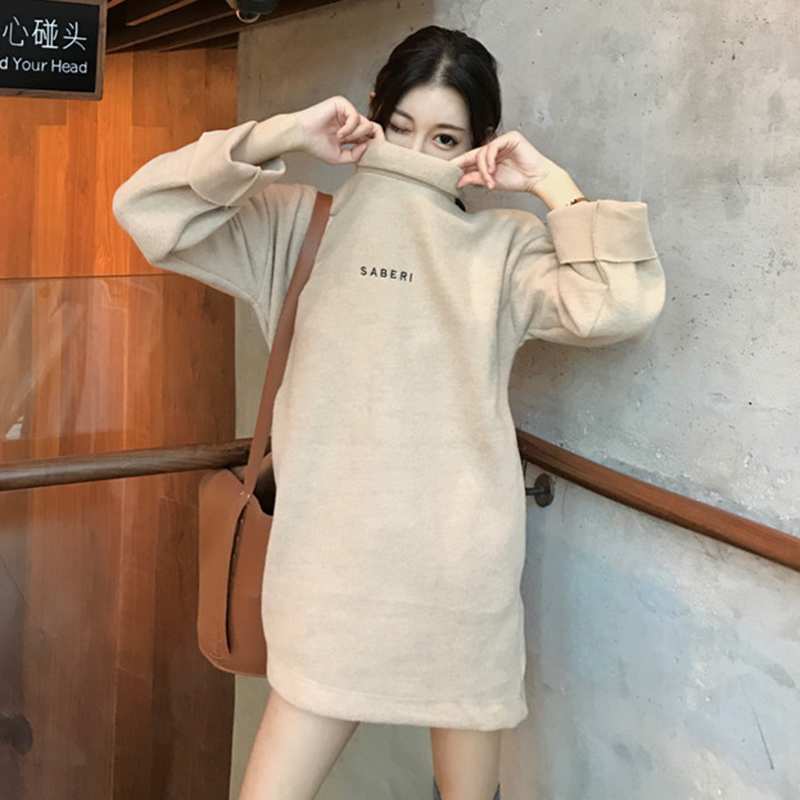 慵懶風高領加絨衛衣裙女秋冬裝2018新款韓版寬松字母刺繡連衣裙子