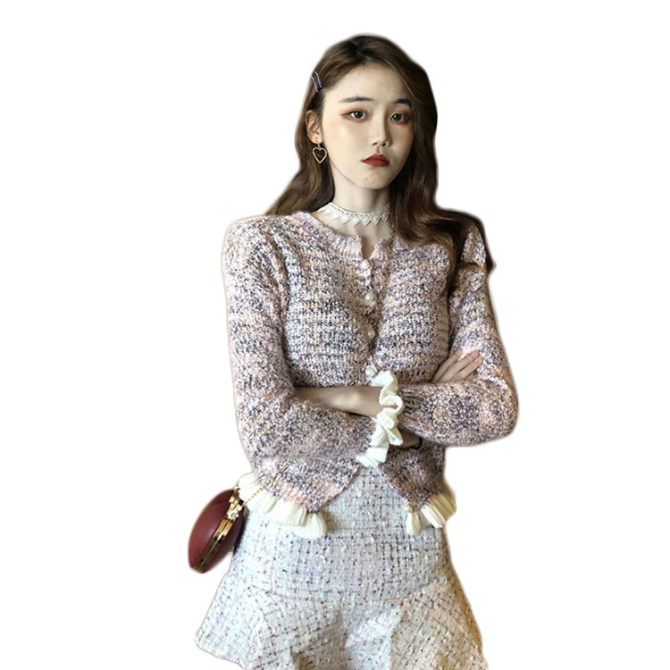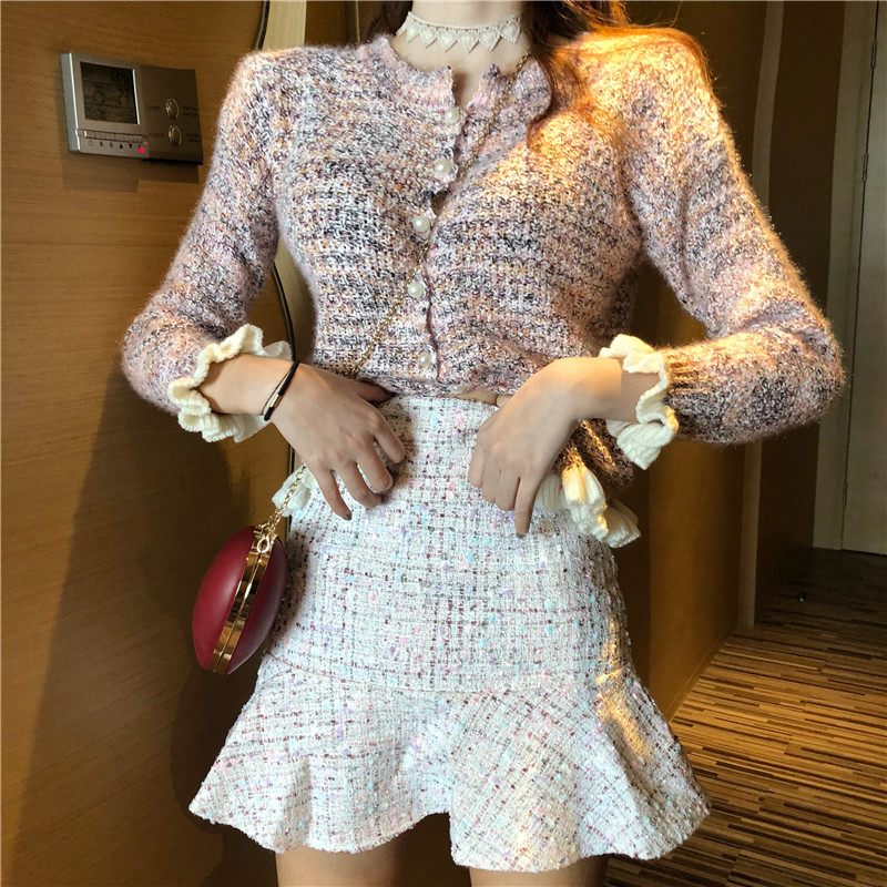 / 秋裝女2018新款套裝復古珠珠扣波浪邊香風開衫+小香風魚尾短呢裙