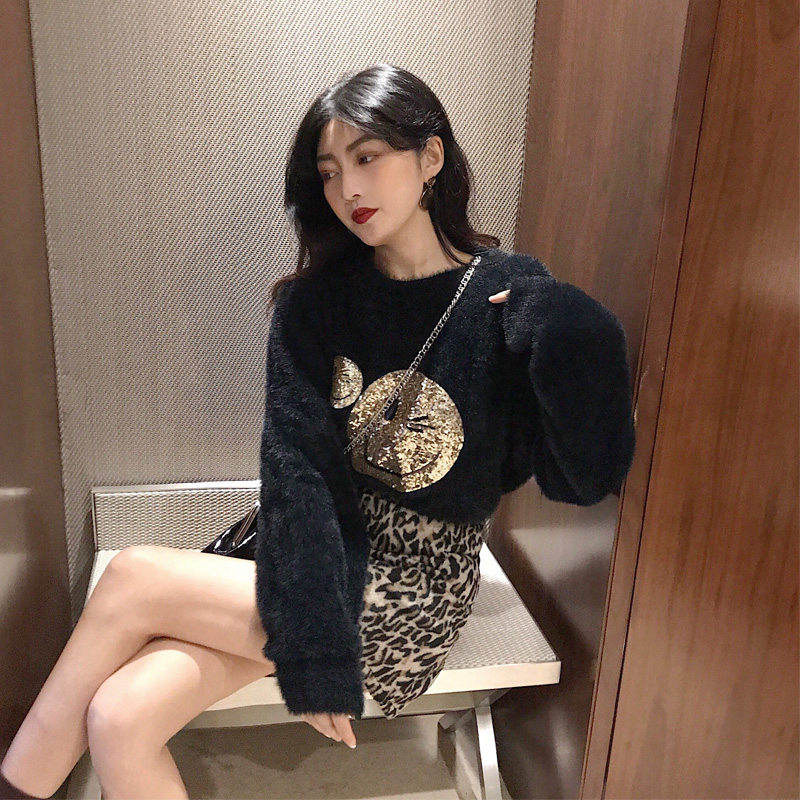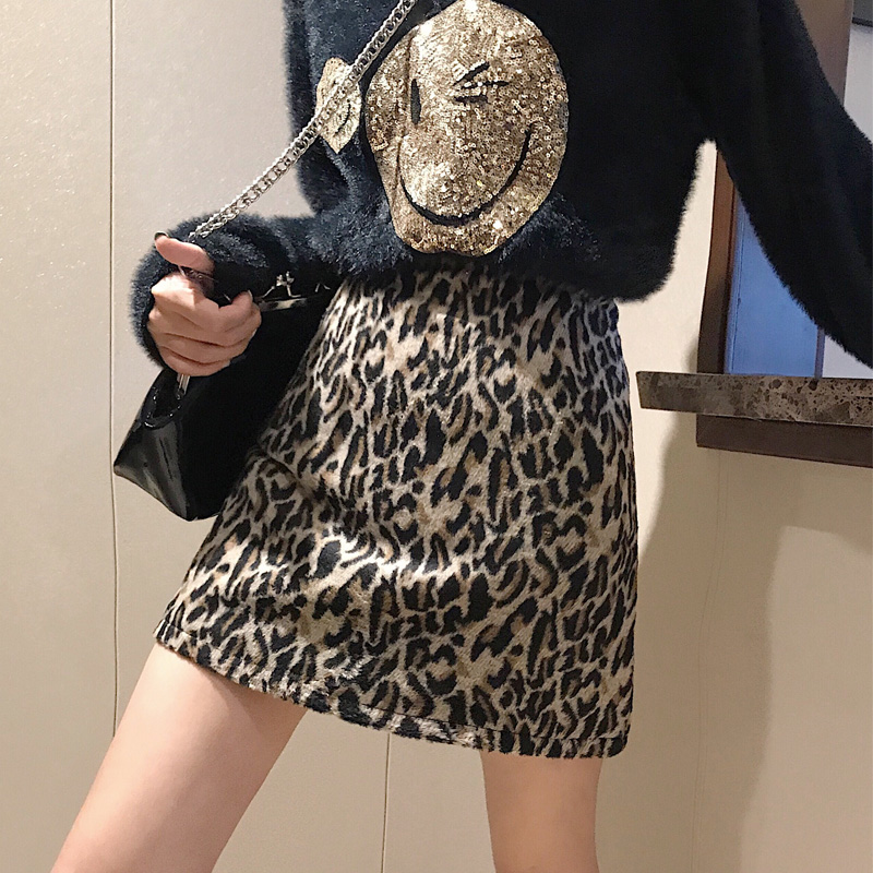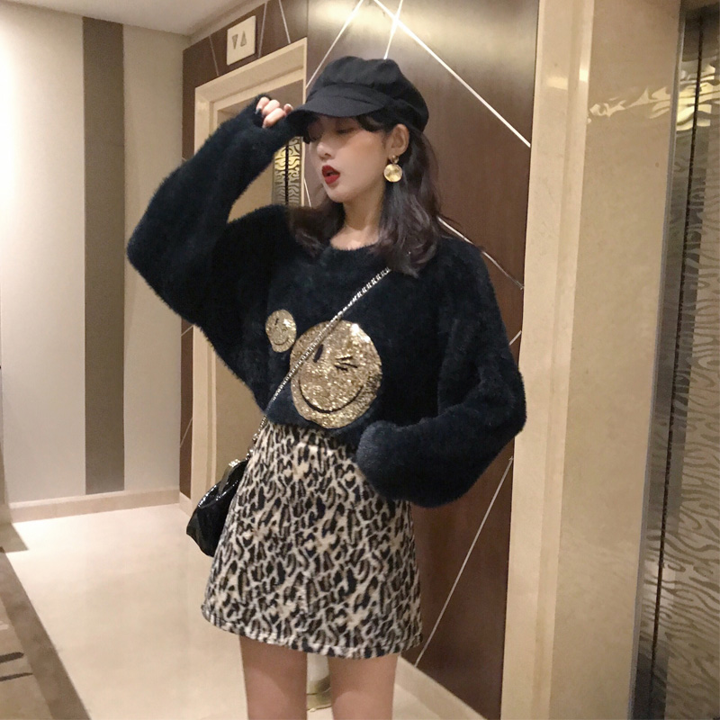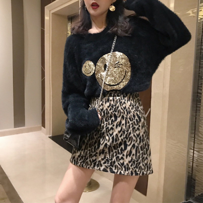 秋裝女2018新款套裝chic豹紋長袖毛衣+韓版百搭高腰A字半身裙皮裙