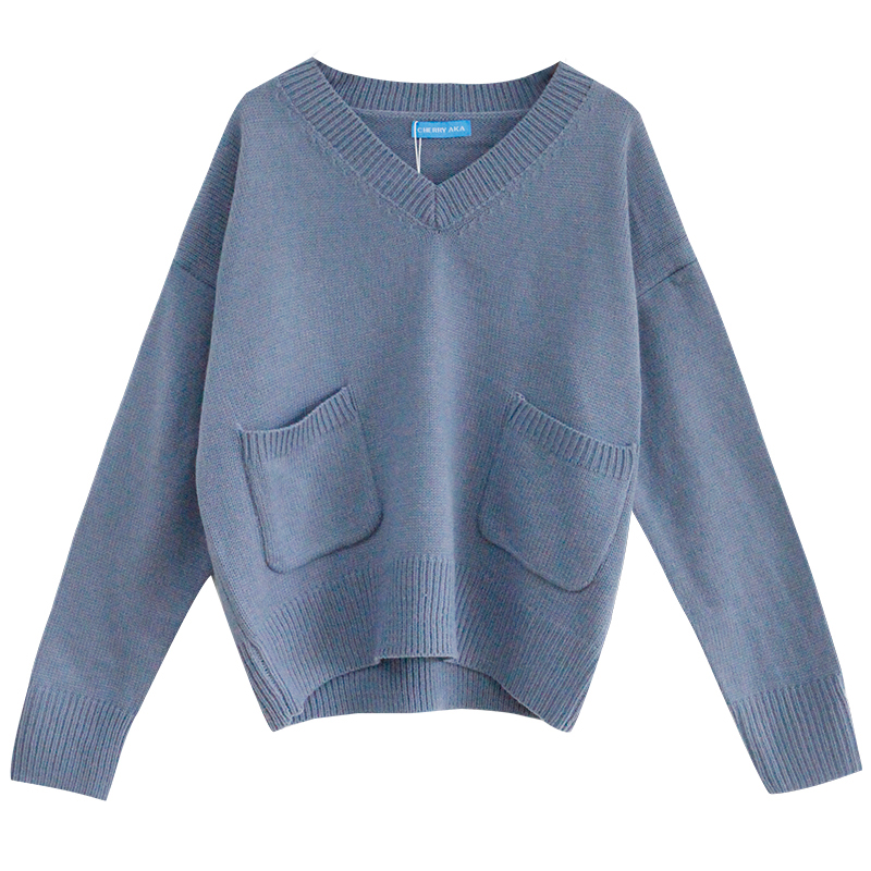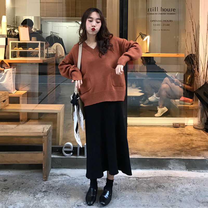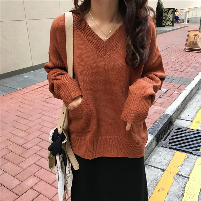秋裝女2018新款韓版寬松V領套頭毛衣學生顯瘦純色長袖針織上衣潮