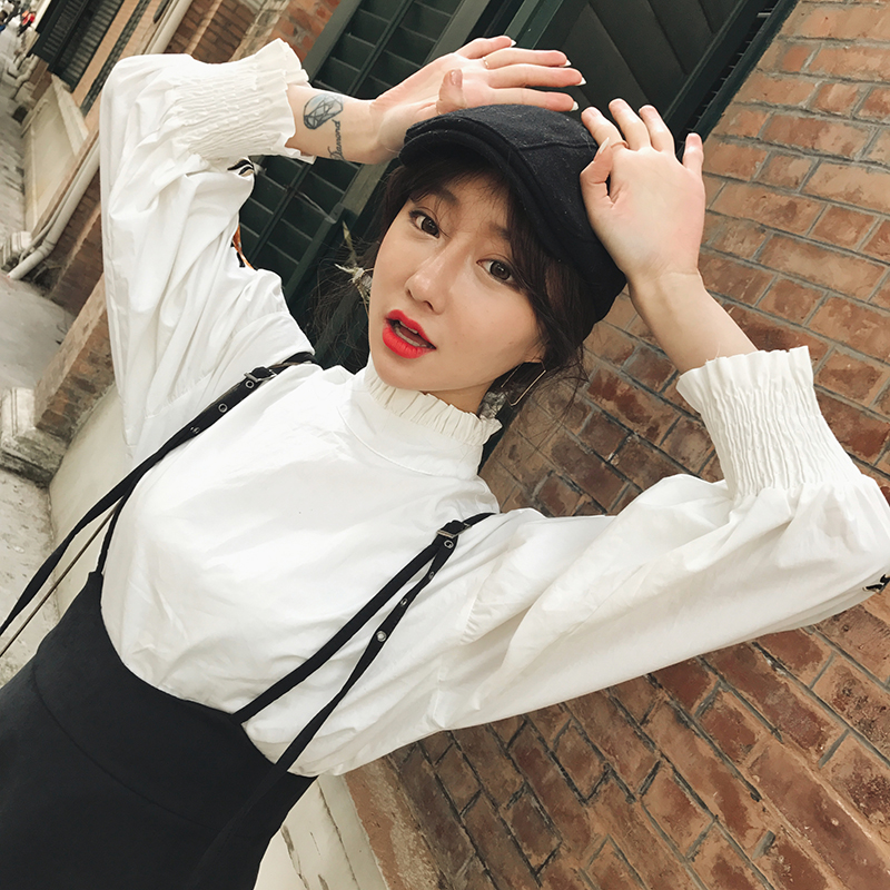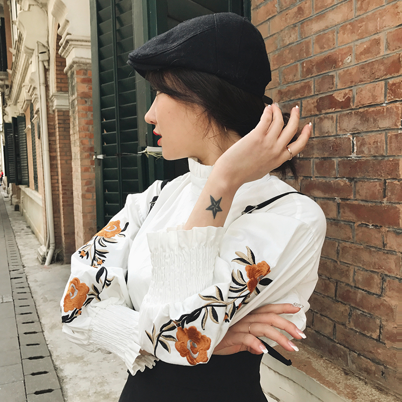 / 學生百搭襯衣女秋裝新款韓版寬松刺繡燈籠袖上衣木耳邊立領白襯衫