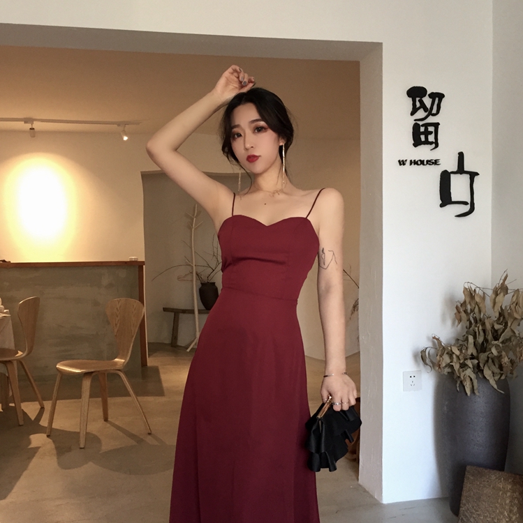 / 復古韓國chic風氣質性感露背交叉綁帶中長款純色連衣裙收腰吊帶裙
