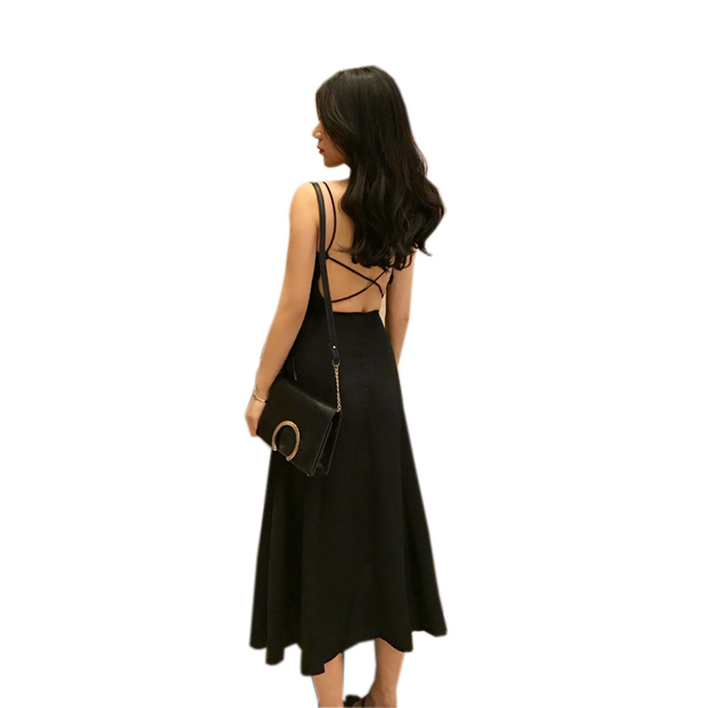 復古韓國chic風氣質性感露背交叉綁帶中長款純色連衣裙收腰吊帶裙