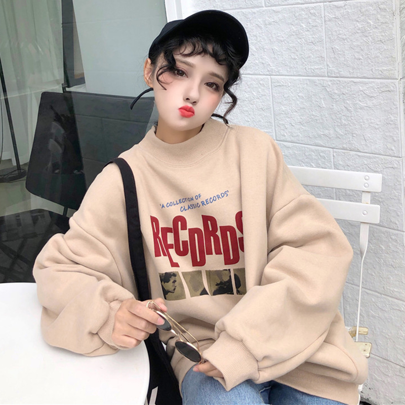 / 小高領字母印花加絨衛衣外套秋冬新款學生寬松套頭保暖長袖上衣女