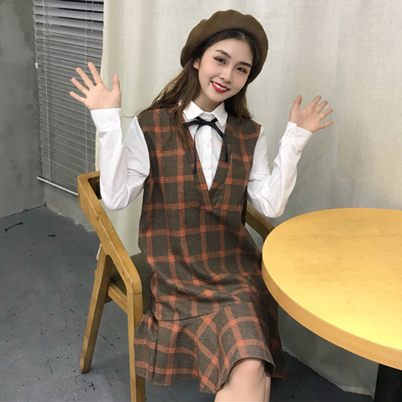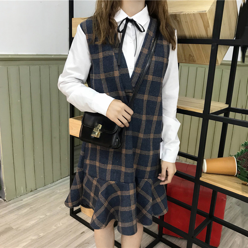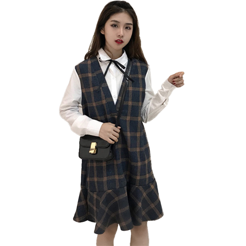 學院風中長裙秋裝女新款韓版學生蝴蝶結格子連衣裙假兩件荷葉裙子