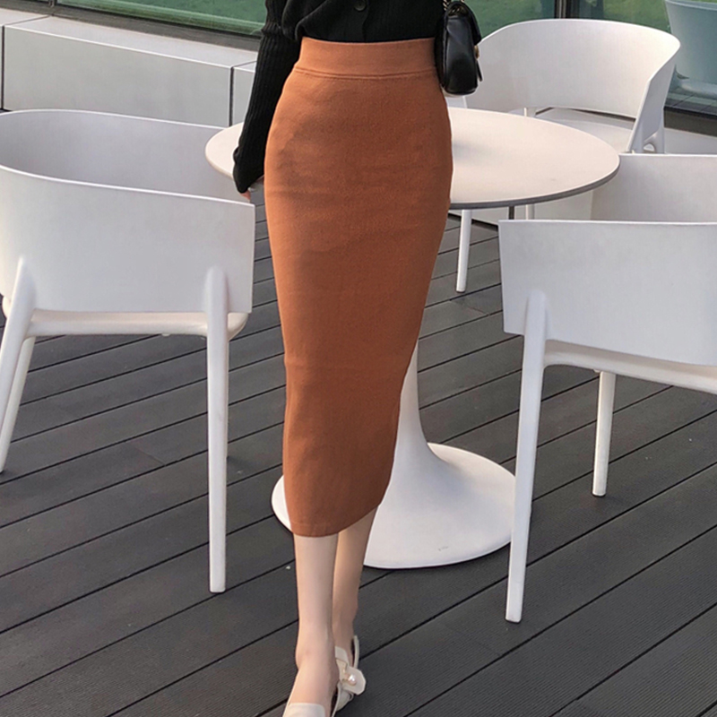 復古高腰開叉修身針織半身裙秋裝女2018新款氣質中長a字包臀裙子