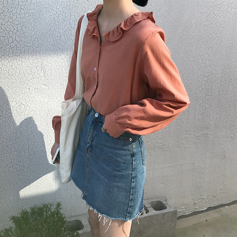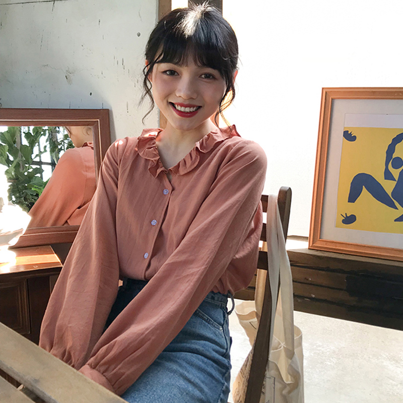 白襯衫女早秋2018新款韓版女裝學生寬松百搭木耳花邊V領長袖上衣