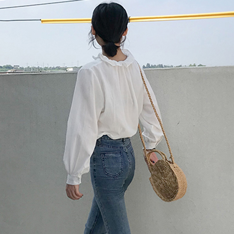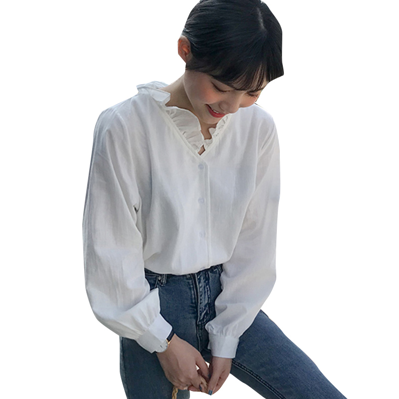 / 白襯衫女早秋2018新款韓版女裝學生寬松百搭木耳花邊V領長袖上衣