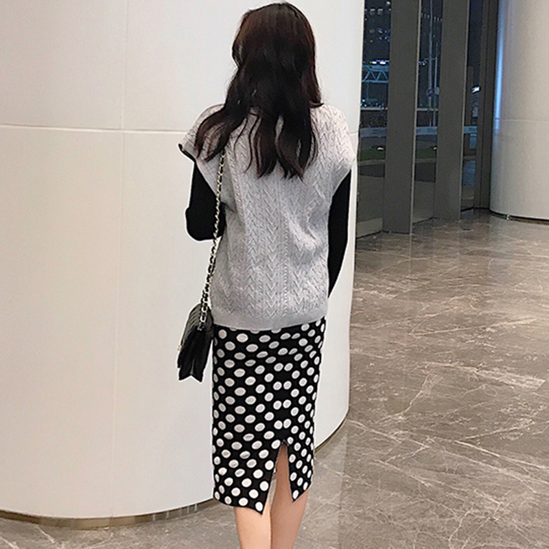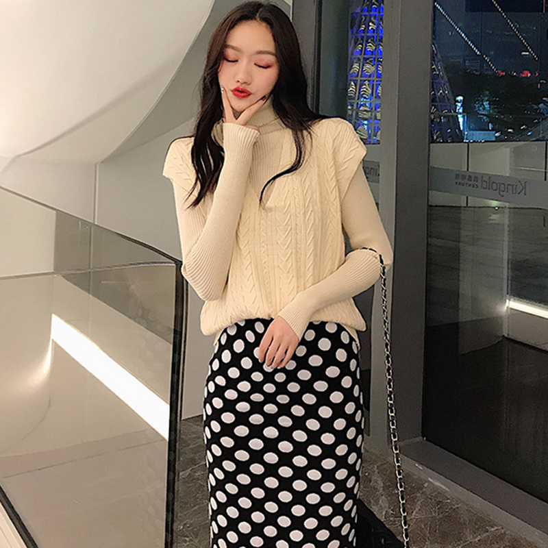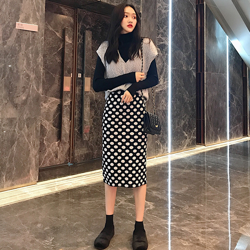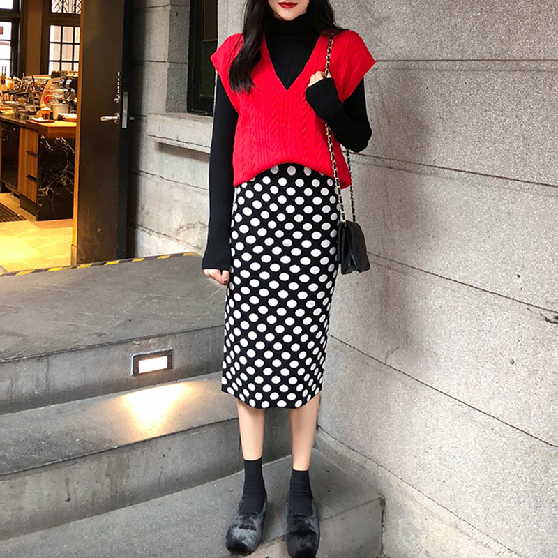 御姐套裝女秋冬新款紅色時尚毛衣馬甲長袖打底衫高腰波點半身裙子