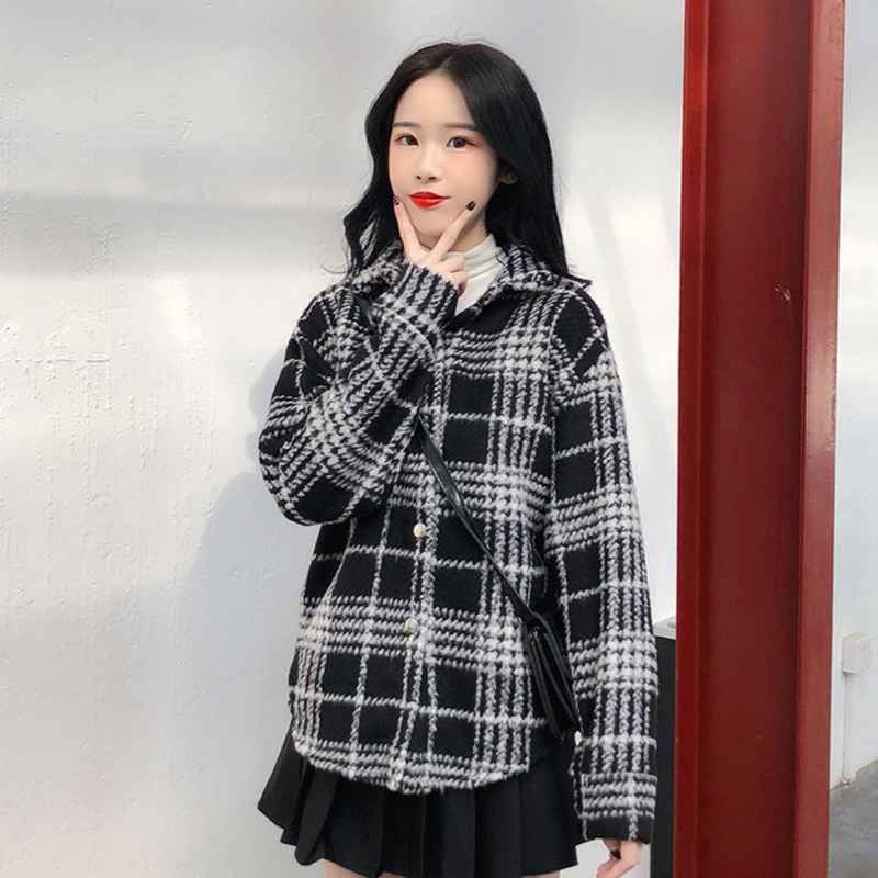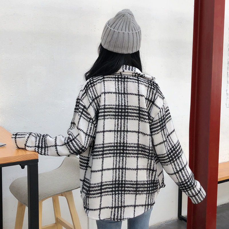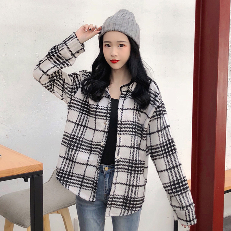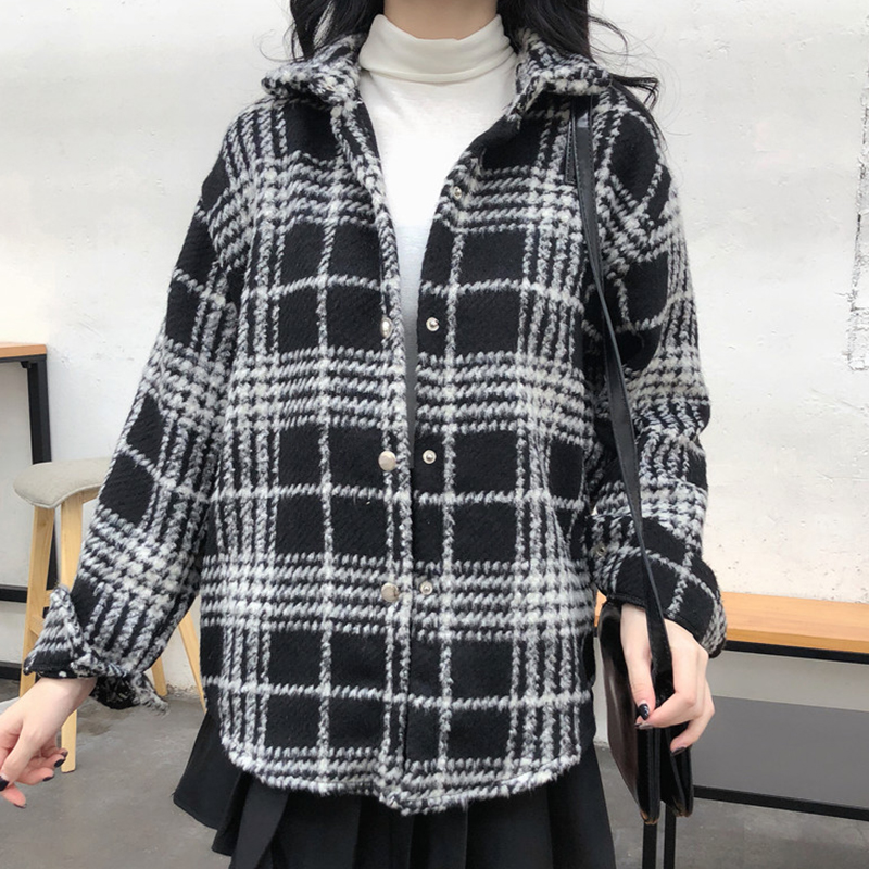 / 復古格子襯衫秋裝女2018新款港味寬松呢子外套學生簡約長袖上衣潮