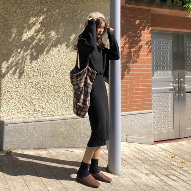 / 氣質女神兩件套秋冬裝新款圓領套頭毛衣高腰顯瘦針織包臀半身裙子