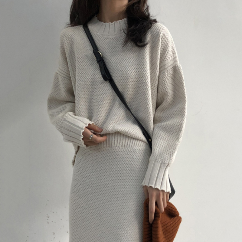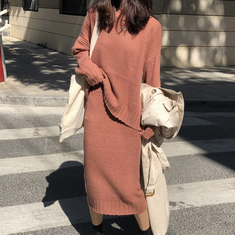 氣質女神兩件套秋冬裝新款圓領套頭毛衣高腰顯瘦針織包臀半身裙子