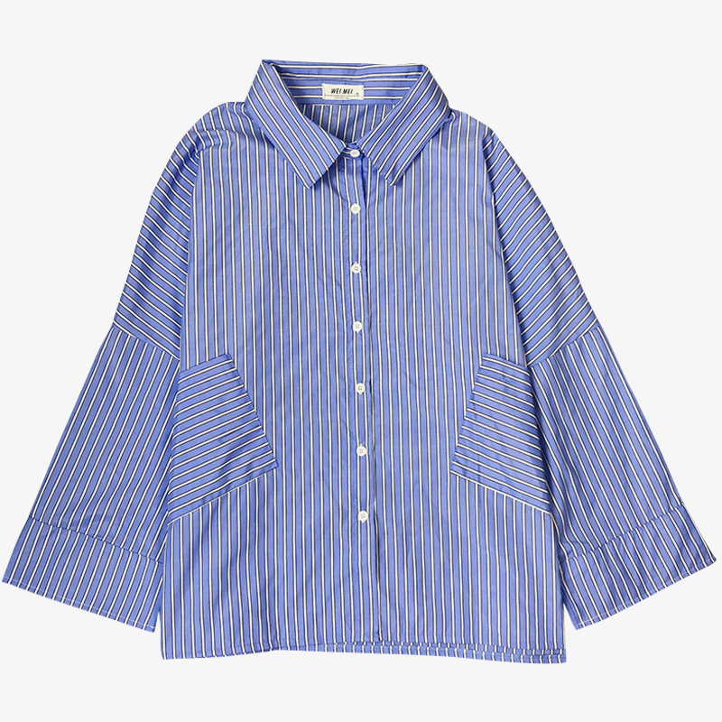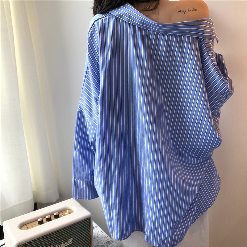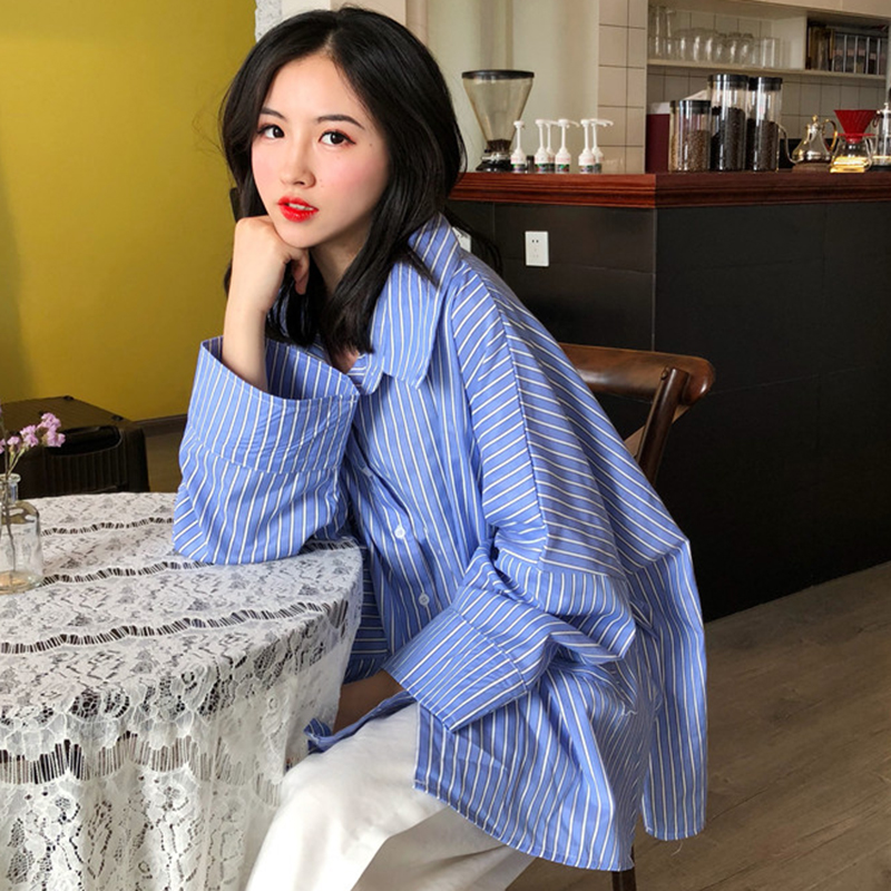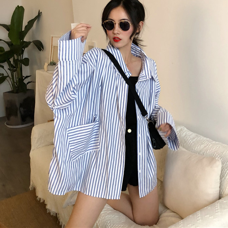 襯衫女夏新款韓版女裝寬松中長款百搭條紋襯衣學生休閑長袖防曬衫
