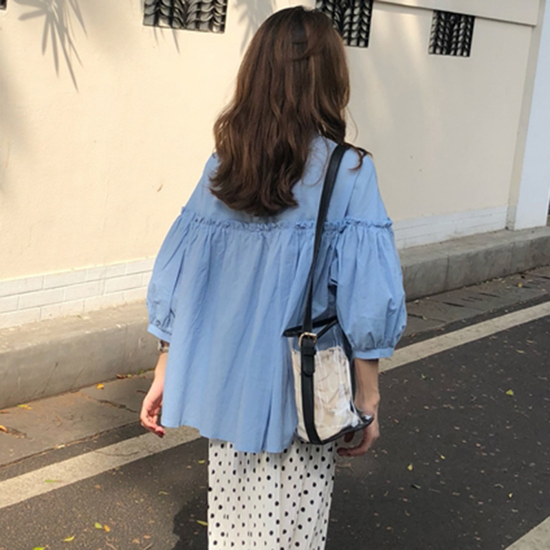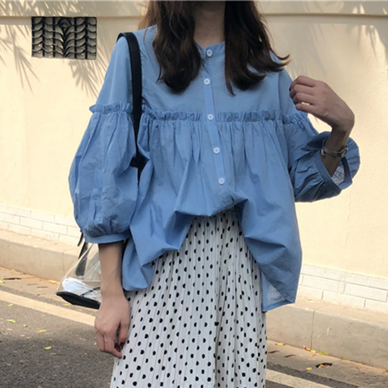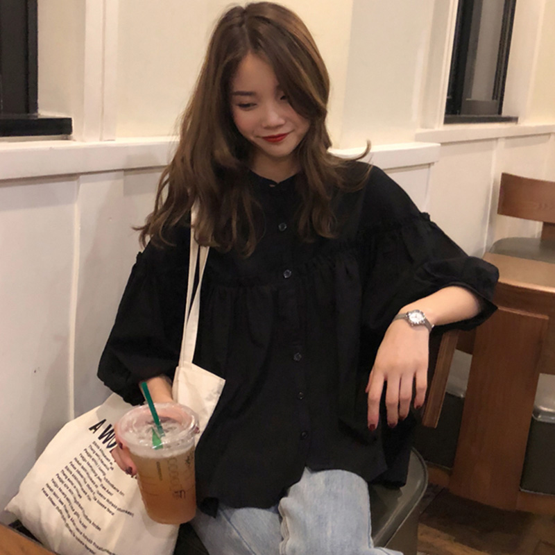 / 秋裝2018新款韓版少女可愛泡泡袖娃娃上衣學生清新簡約寬松黑襯衫