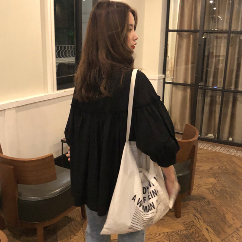 秋裝2018新款韓版少女可愛泡泡袖娃娃上衣學生清新簡約寬松黑襯衫