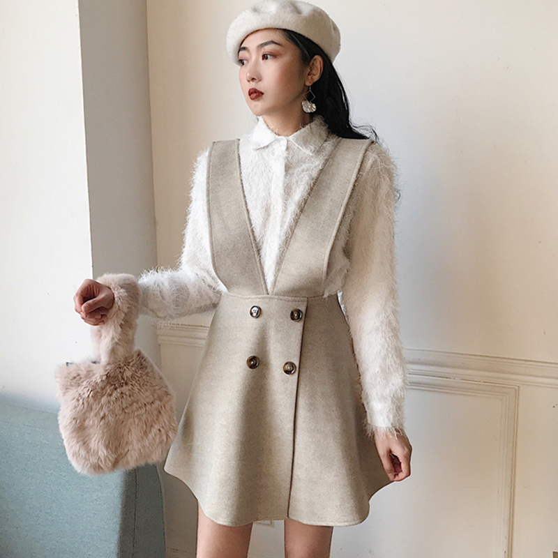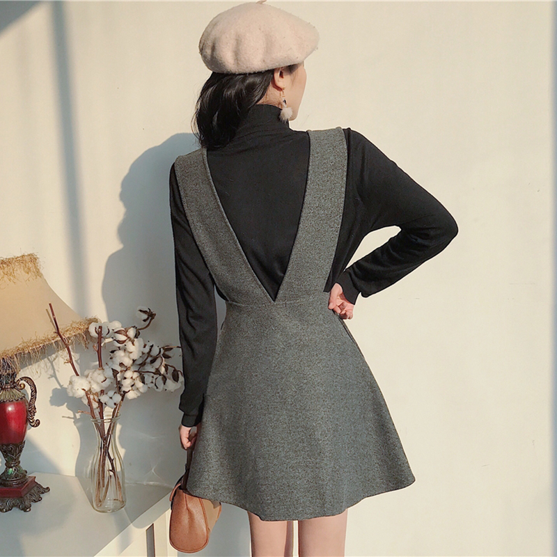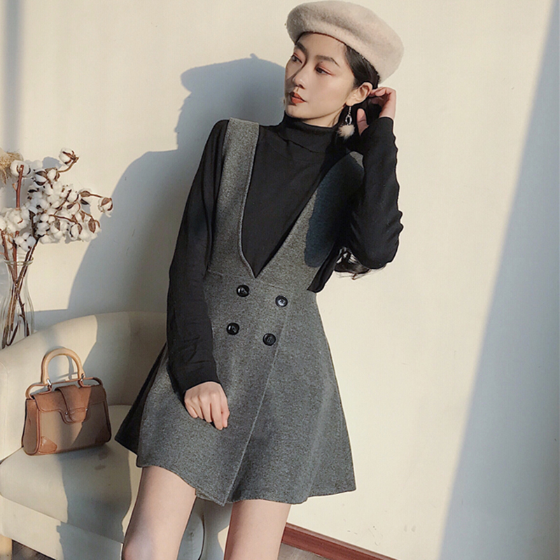 / 復古無袖背帶egg風連衣裙子女秋冬裝新款高腰顯瘦毛呢A字桔梗短裙