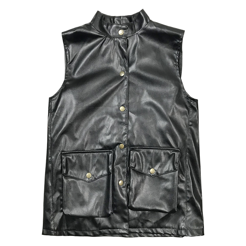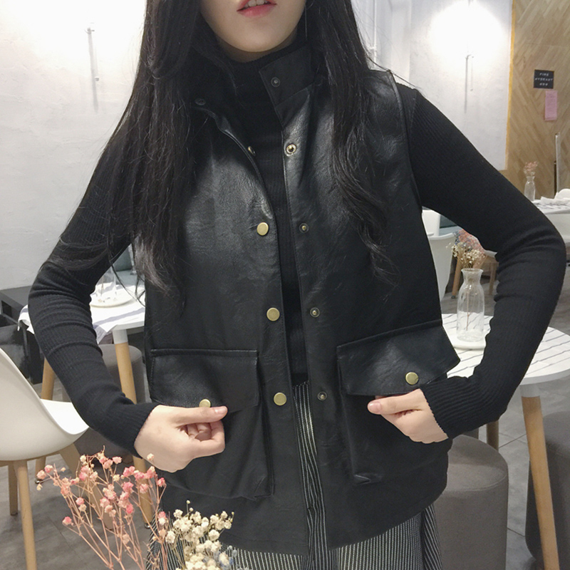 / 秋裝新款女裝修身顯瘦薄款PU皮衣機車馬甲港風小立領學生無袖外套