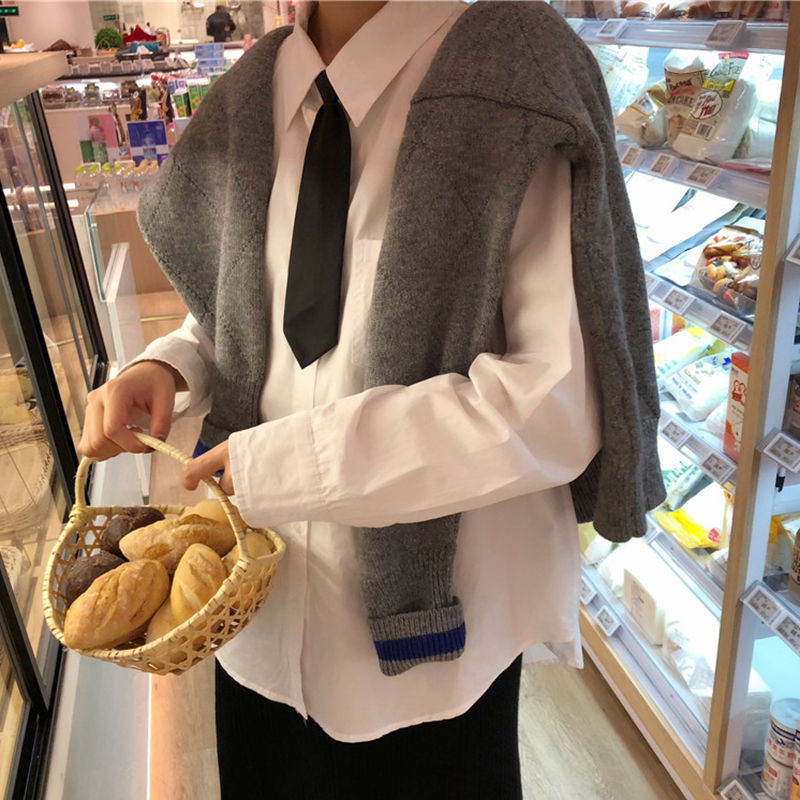 御姐套裝女秋冬新款韓版寬松V領毛衣針織衫外套白色長袖襯衫上衣