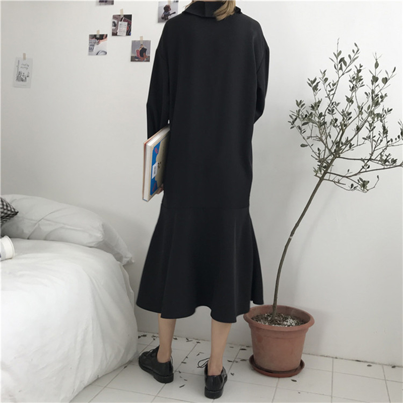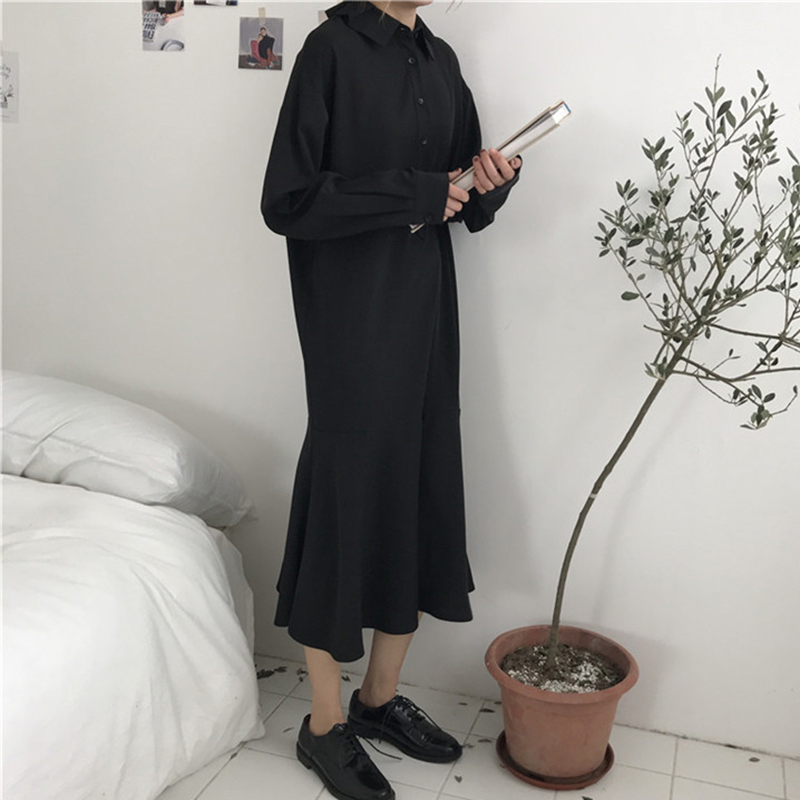 / 連衣裙秋裝2018新款女 長袖襯衫裙 寬松秋季全身裙 小黑長裙魚尾