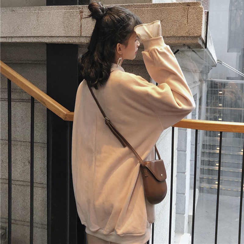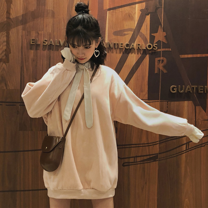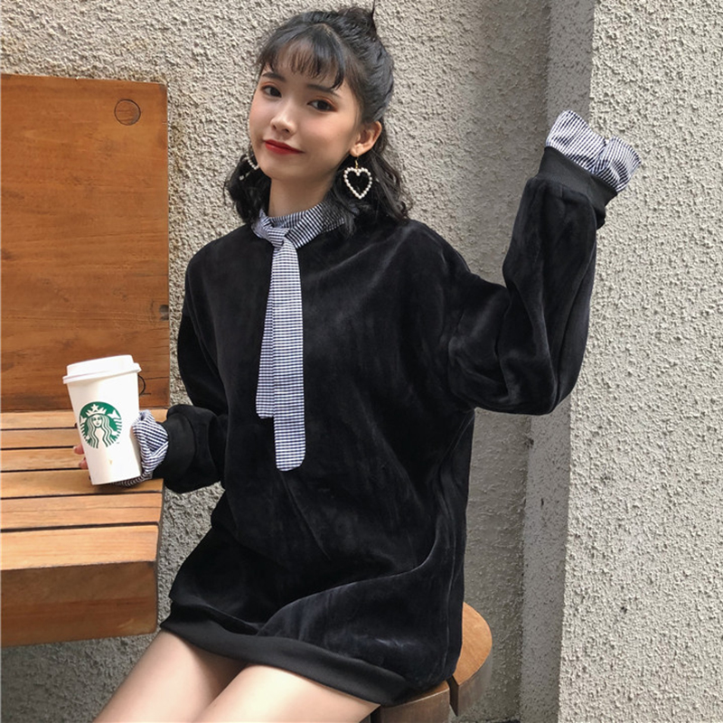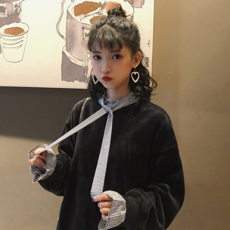 / 拼接假兩件加絨衛衣2018新款女秋冬裝港風金絲絨外套寬松長袖上衣