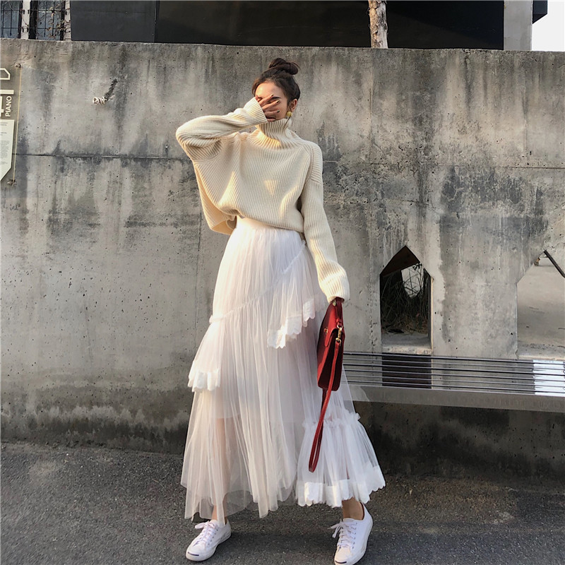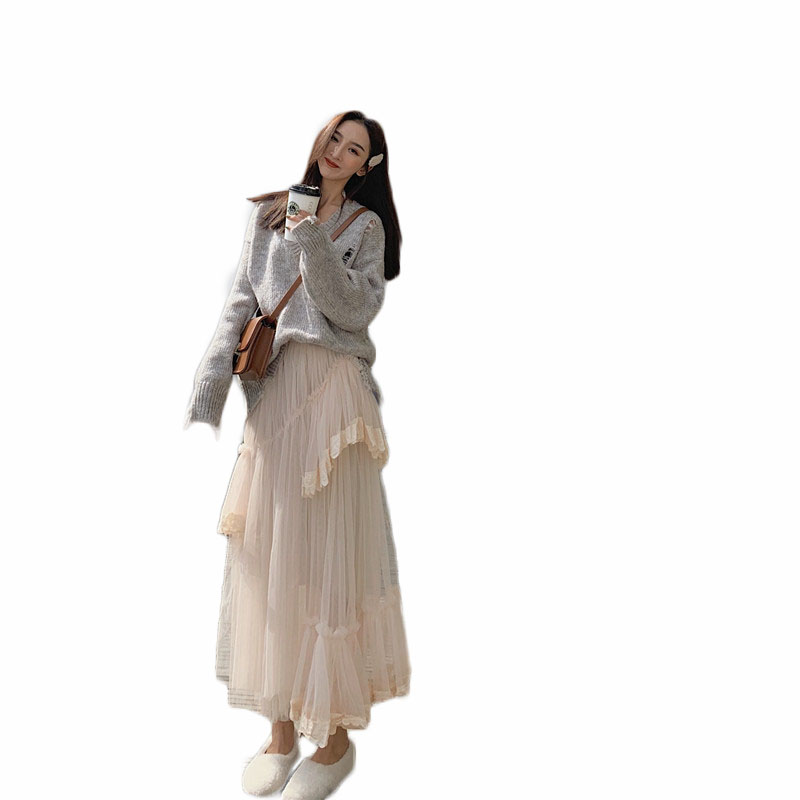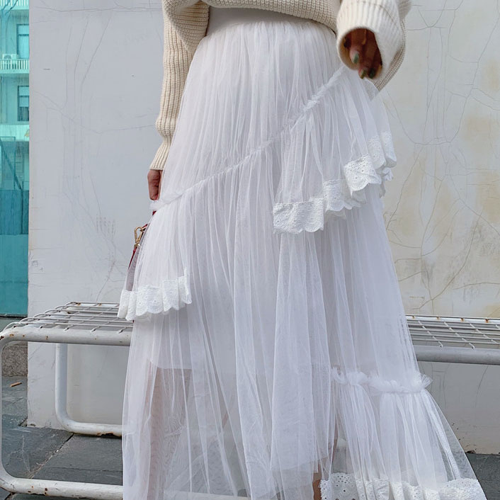 港味裙子女秋冬2018新款時尚網紗拼接花邊百搭不規則高腰半身裙女